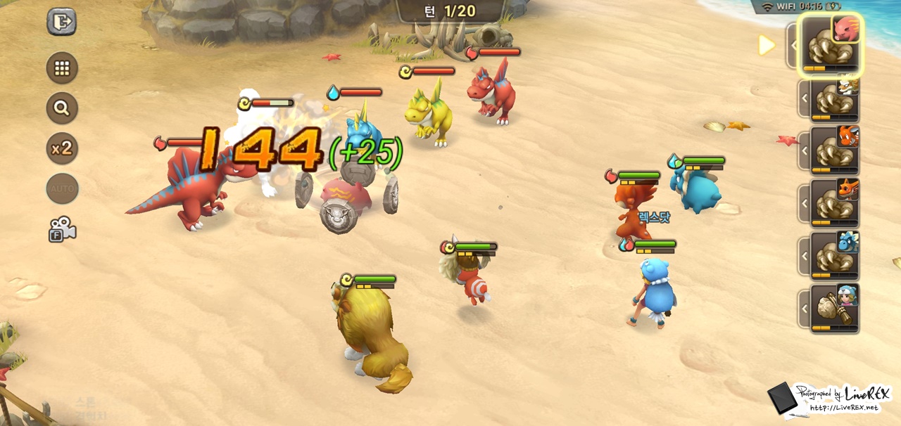 아래 보이는 장면들이 바로 스톤에이지 월드에서의 전투 모습입니다. 턴제 방식으로 진행하는데요. 초반에는 큰 어려움 없이 승리를 챙길 수 있을텐데, 당연히 시간이 지날 수록 공격시 공격 목표를 집중한다든지 스킬 등을 상성에 맞춰 사용하는 것 같은 전략적인 운영이 필요합니다.