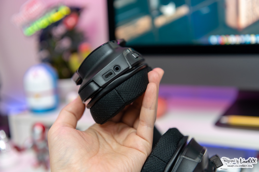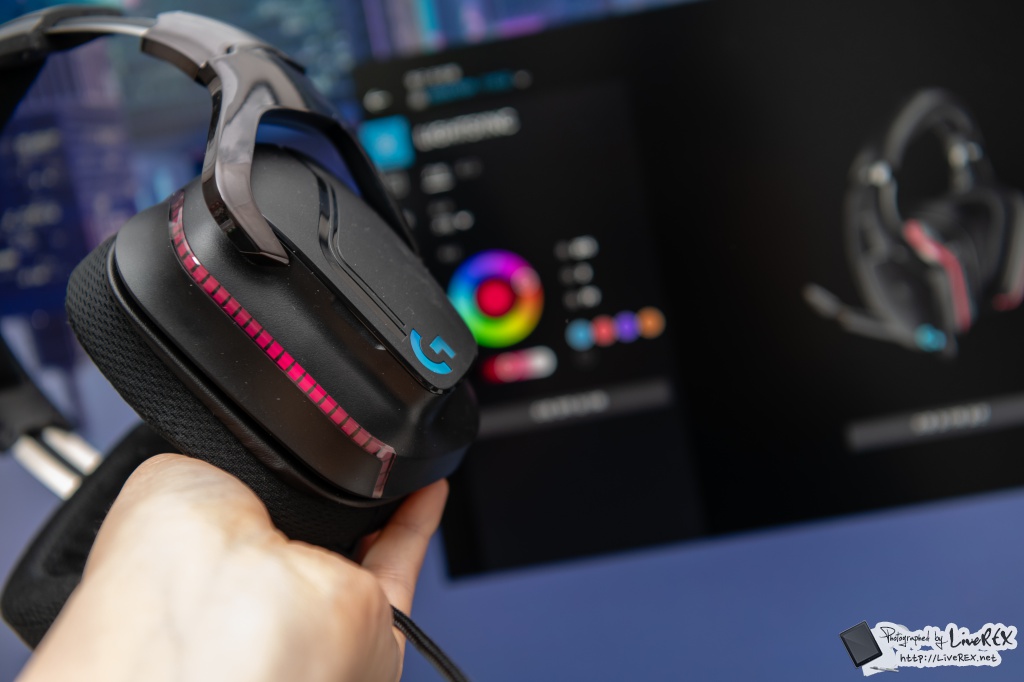헤드셋을 연결하면 바로 그 화려한 멋을 체감할 수 있습니다. RGB 조명이 들어오는데요. 무려 1680만 가지 컬러를 지원합니다. 아래에서 언급하겠지만, ‘G HUB’를 통해 원하는 설정이 가능합니다.