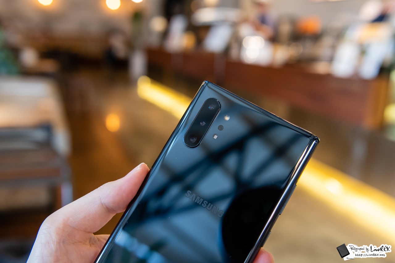 이어서 후면을 볼까요. 갤럭시노트10 플러스 경우 쿼드 카메라가 세로 배열로 자리하고 있는데요. 일반, 초광각, 망원 그리고 ToF 센서가 담겨 있습니다. ▼