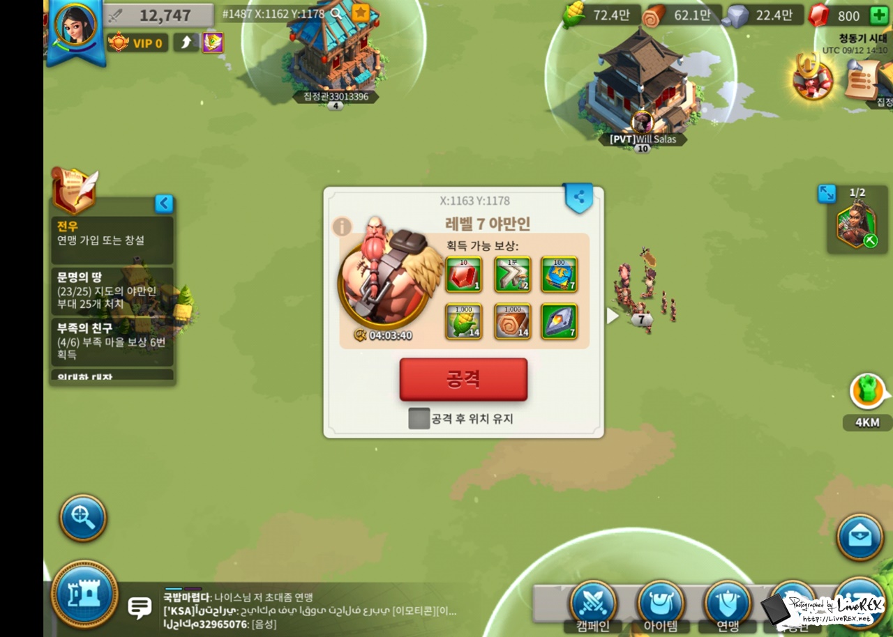당연한 이야기지만, 다른 이용자를 공격하는 것도 가능합니다. 상대 진영을 살펴보고 문명의 발전 정도를 잘 파악한 후 공격을 해서 자원 약탈 등을 할 수 있는데요. 연맹에 가입한 상태라면, 주변의 도움을 받는 것도 팁이 되겠네요.