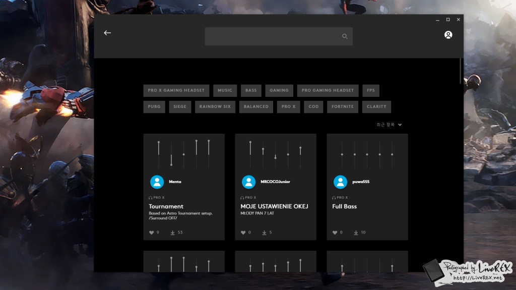 덧붙여, 전에도 말한 것처럼 G HUB에서는 프로게이머들이 설정한 오디오 EQ 프로필을 다운로드해서 설정할 수 있고, 다운받은 프로필에서 본인 취향에 맞게 살짝 조절도 가능해서 간편하게 자신에게 맞는, 동시에 게임에 꼭 어울리는 사운드를 즐길 수 있습니다. ▼