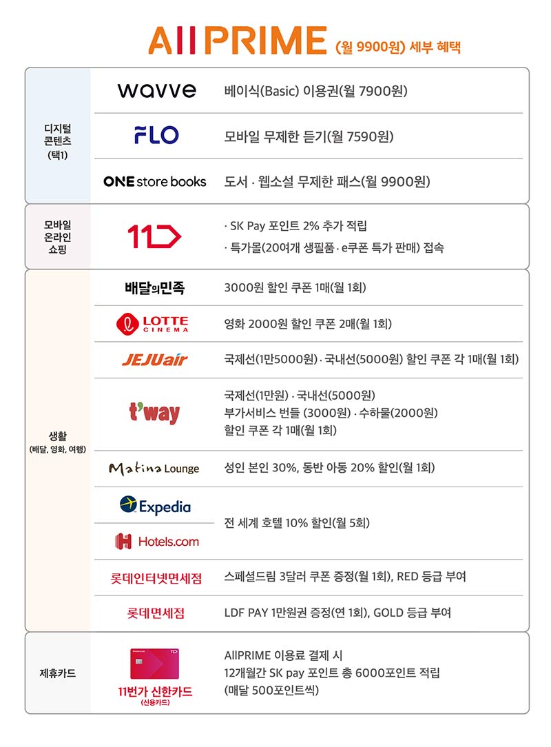 끝으로, 제휴카드 혜택도 있어요. 올프라임 월 이용료를 ‘11번가 신한카드’로 결제하면 12개월간 SK pay 포인트를 매달 500포인트씩 총 6천 포인트를 적립 받을 수 있습니다. ▼