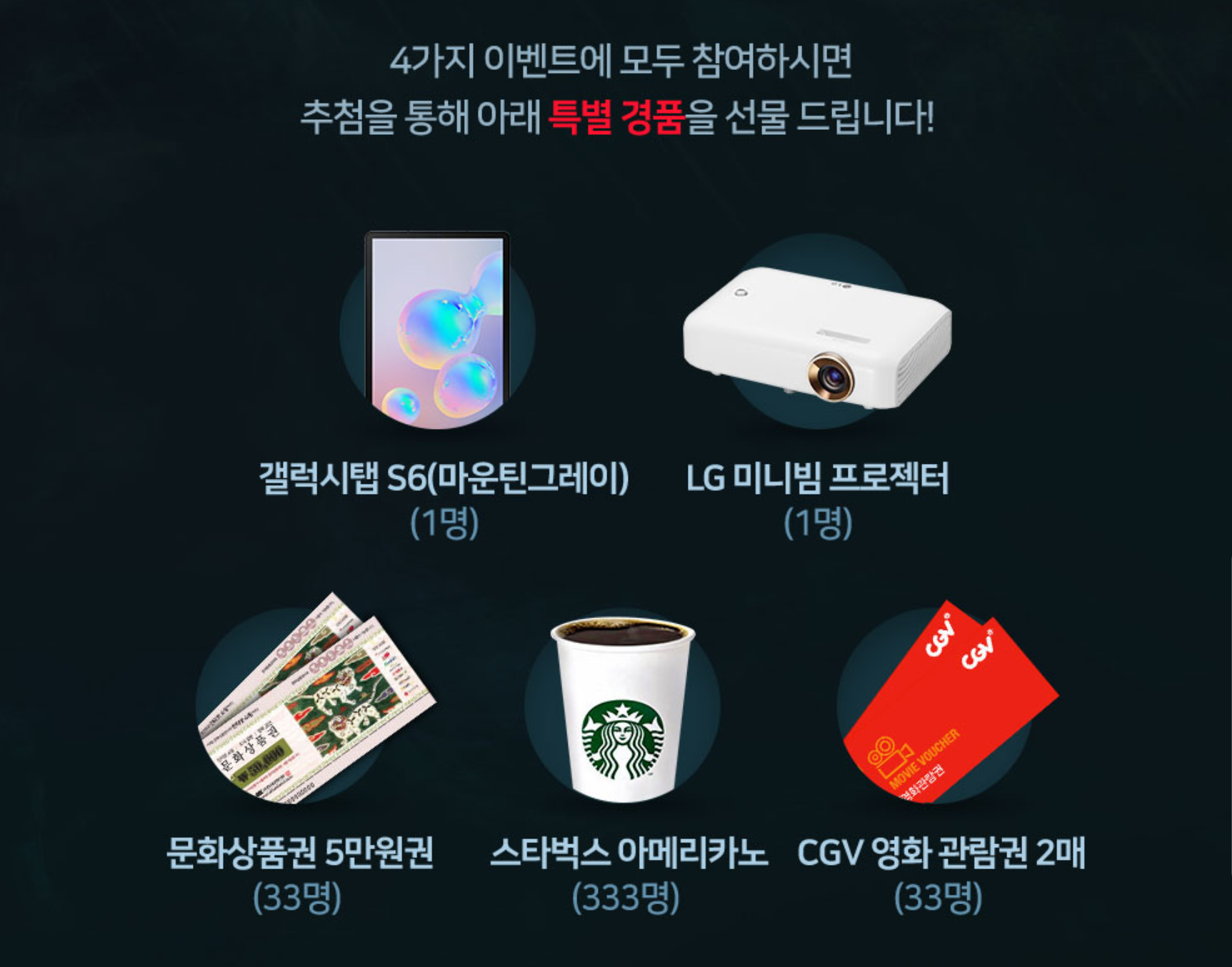 4가지 이벤트에 참여하는 이들에게는 5만원 상당의 아이템을 100% 증정하고, LG LED TV 모니터 / 미니빔 프로젝터 / 문화상품권 / 스타벅스 커피 등 다양한 선물도 제공됩니다.