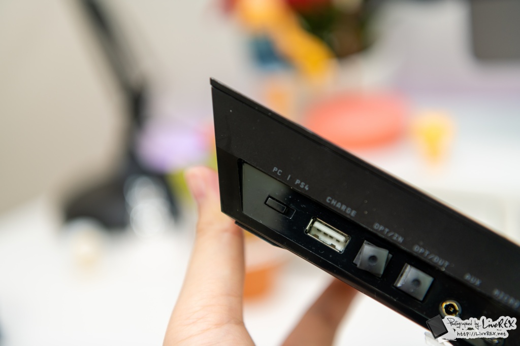 베이스 스테이션의 뒷면에는 PC와 PS4를 선택할 수 있는 스위치, 별도의 스마트 기기를 충전할 수 있는 USB 출력 포트, 플레이스테이션을 연결할 때 이용할 수 있는 OPT IN/OUT 단자와 AUX, 충전 및 데이터 전송을 위한 마이크로 USB 단자가 자리하고 있어요. ▼
