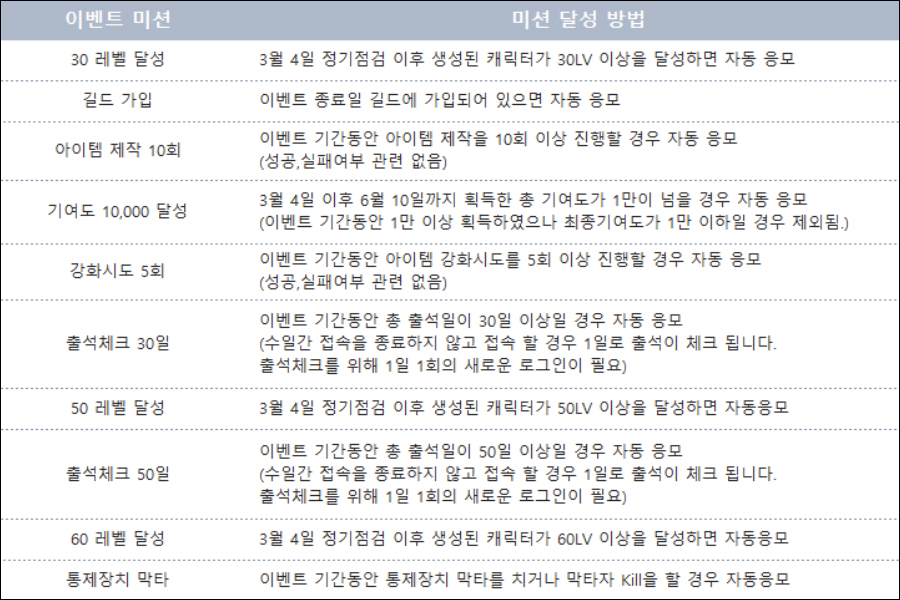 이를 득템하기 위한 노력은 어찌보면 당연한 게 아닐까 싶은데요. 주어진 이벤트 미션을 달성하면 되는데, 그 리스트를 살펴보면 레벨 달성, 길드 가입, 아이템 제작, 기여도 달성, 강화 시도, 출석체크, 통제장치 막타 등 의외로 난이도가 낮은 수준임을 다들 아실 수 있을 겁니다.