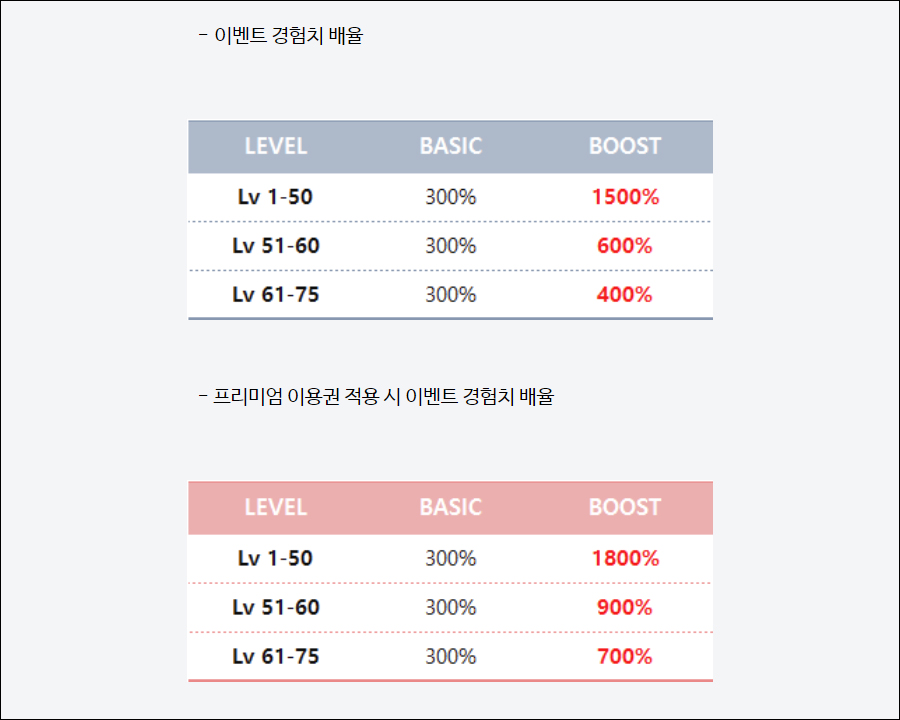덧붙여, 신규 캐릭터라면 프리미엄 이용권을 적용하면서 이벤트 경험치 배율이 각각 1800%, 900%, 700%로 상승합니다. 그러니 더 빠른 육성이 가능하겠죠? 이런 이유에서 새롭게 캐릭터를 만들더라도 진입장벽이 낮아 더 재미를 느끼고, 몰입을 할 수 있지 않나 하는 생각도 듭니다.