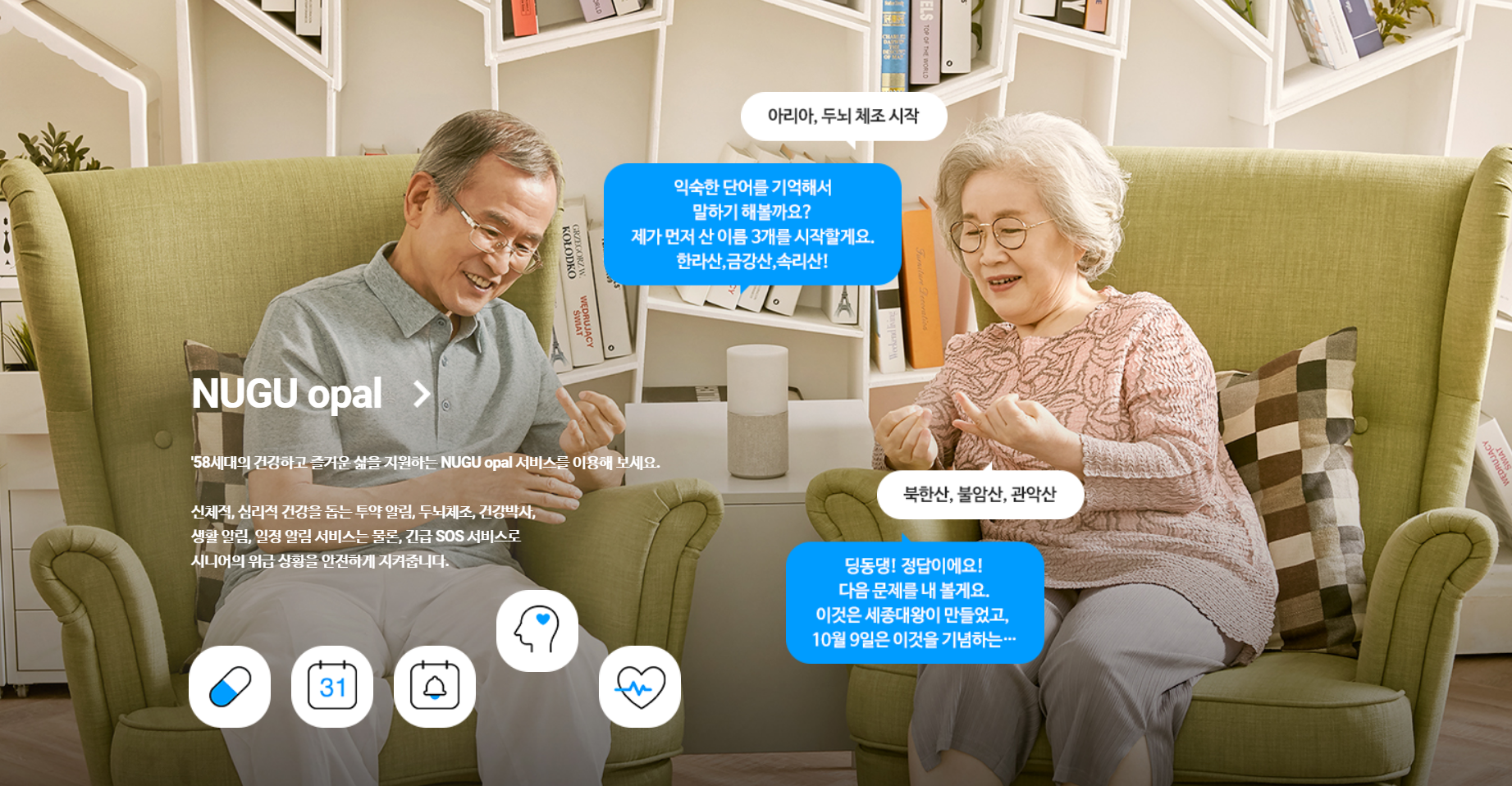 서비스 가입을 마치면 메인 메뉴에서 NUGU opal 전용 서비스를 살펴볼 수 있습니다. 앞서 언급한 투약 알림, 일정 알림, 생활 알림, 두뇌 체조 등이 표시되는 걸 알 수 있네요. ▼