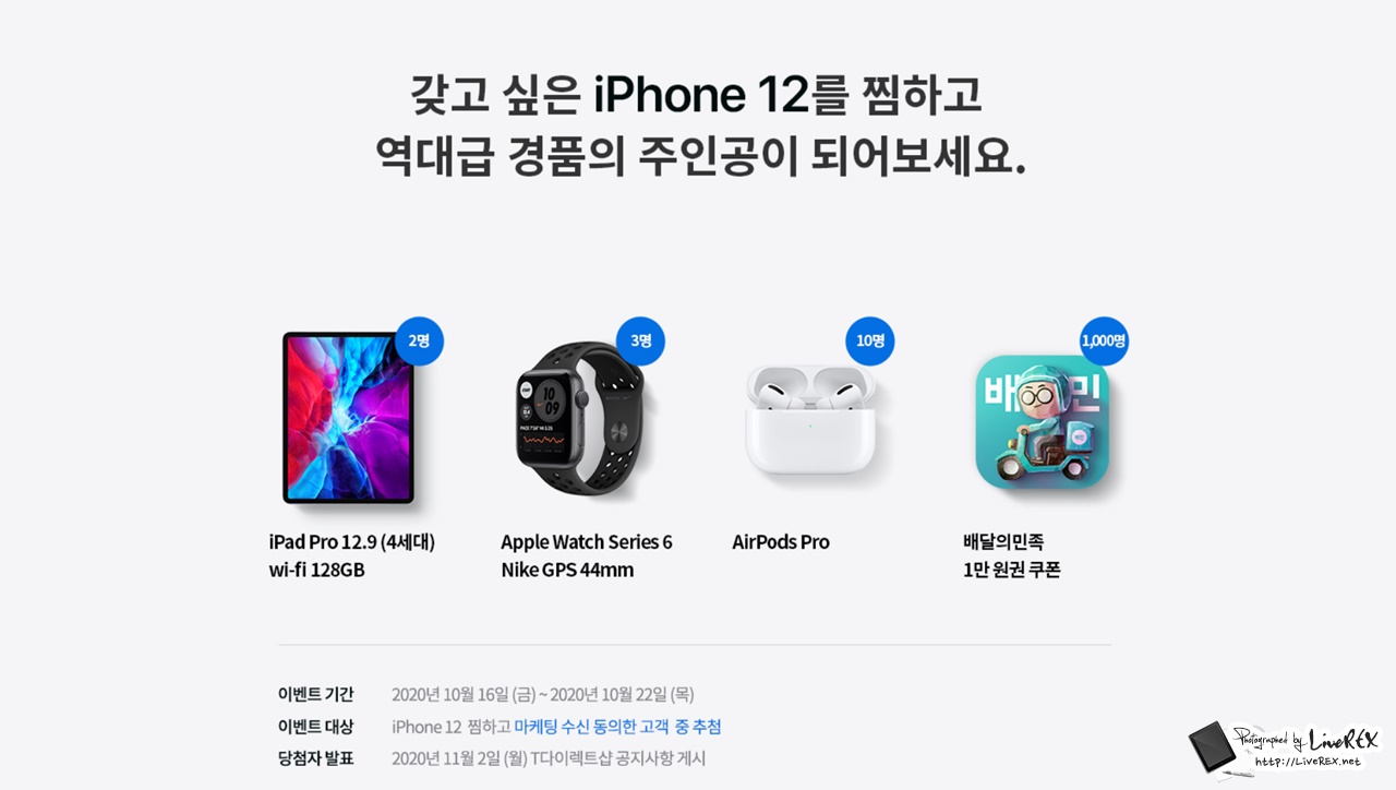 아직까지 구체적인 정보가 나온건 아니지만, 사전예약이 시작되기 전임에도 알아두면 좋은 이벤트가 있습니다. 아이패드 프로 12.9 4세대, 애플 워치 시리즈 6 나이키 44mm, 에어팟 프로 등 다양한 경품을 얻을 수 있는 기회가 마련되어 있네요. ▼