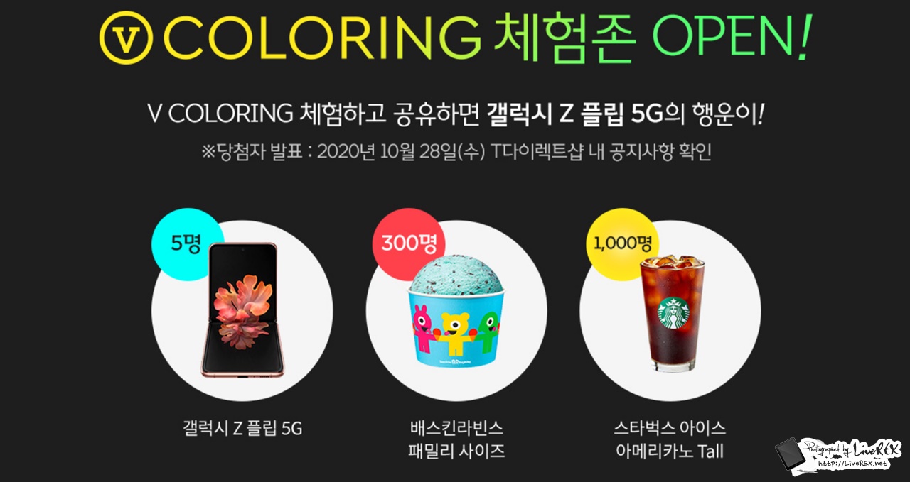 이 외에도 V컬러링 체험존 관련 이벤트가 있는데, 응모를 하면 추첨을 하여 갤럭시Z 플립 5G, 배스킨 라빈스 패밀리 사이즈, 스타벅스 아메리카노 등이 지급됩니다. 이 또한 빵빵한(?) 선물이 마련되어 있는 만큼 관심있는 분들은 도전해 보시는 것도 좋을 듯 싶네요. ▼