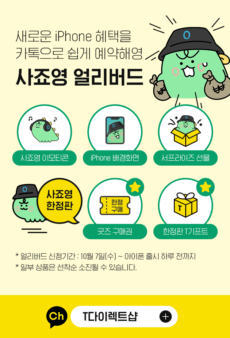 얼리버드 신청을 하면 카카오톡을 통해 출시 정보와 구매 혜택 사죠영 한정판 굿즈 혜택 소식을 받을 수 있어요.