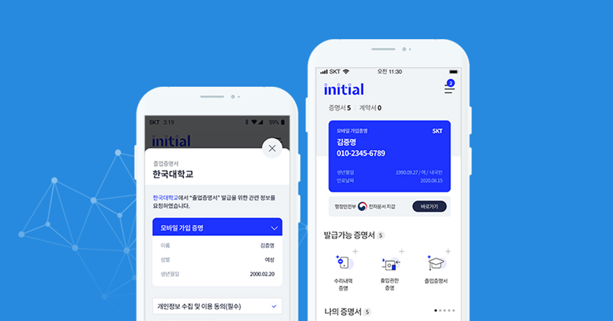 ‘이니셜’ 전자문서 지갑 서비스가 그것인데요. 지난 9월 SKT와 행정안전부가 체결한 전자증명서 발급·유통시스템 이용 활성화를 위한 업무협약 이후로 스마트폰에서 관련된 사용이 가능하도록 행정안전부가 운영하는 정부24와 ‘이니셜’ 앱을 연동하는 방식으로 구현됐다고 하네요.