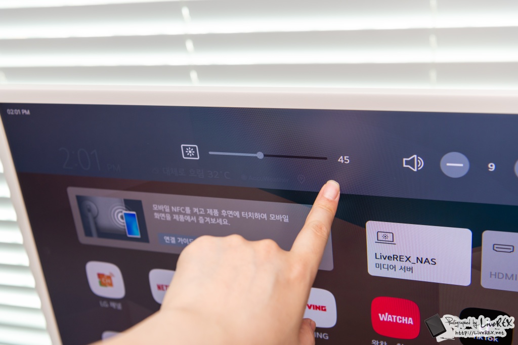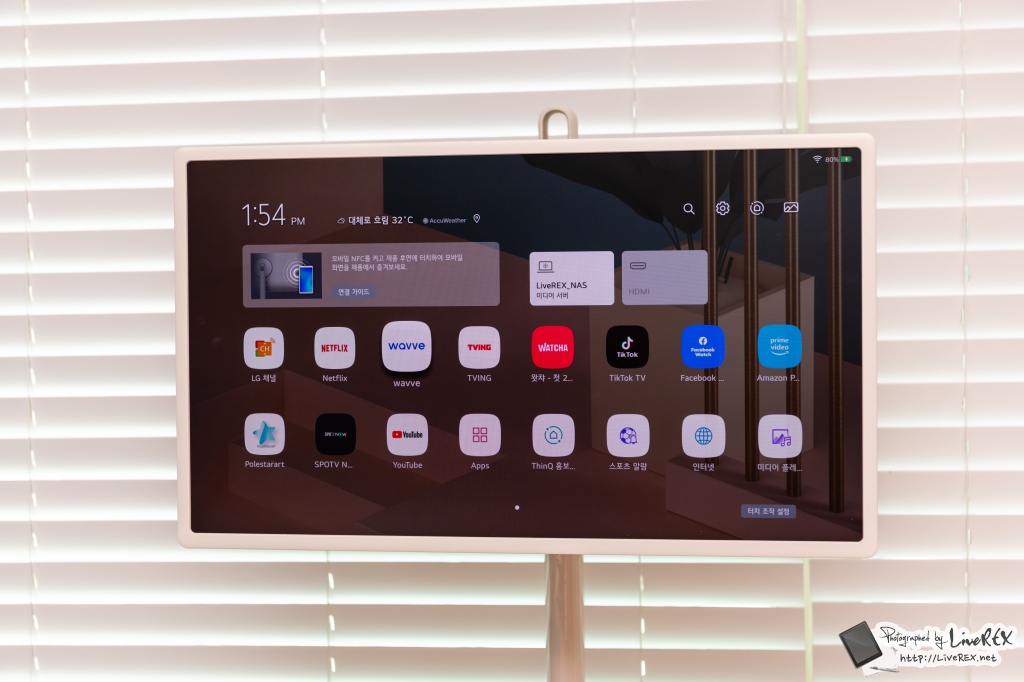제품에 앱을 설치해 각종 콘텐츠를 이용할 수도 있지만 스마트폰과 연동해 더 다양한 활용도 할 수 있어요. 뒷면에 있는 NFC 로고에 폰을 가져대면 바로 연동이 됩니다. 참고로, 스마트폰 전용 거치대가 있어서 색다른 스크린 사용 경험을 가질 수도 있어요.